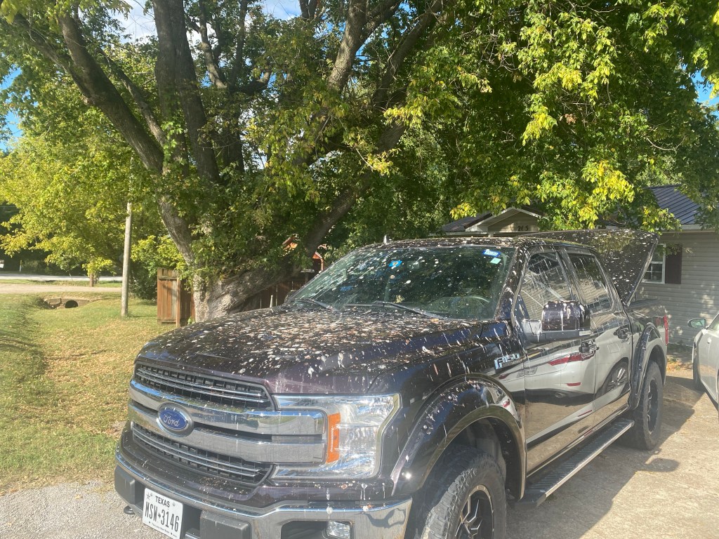 Then there’s the early morning gifts from the birds. Seriously y’all, look at this picture. How much poop can one tree drop? We had to take it to the car wash, and the drive-through guy just shook his head and said “That ain’t coming off with this wash.”