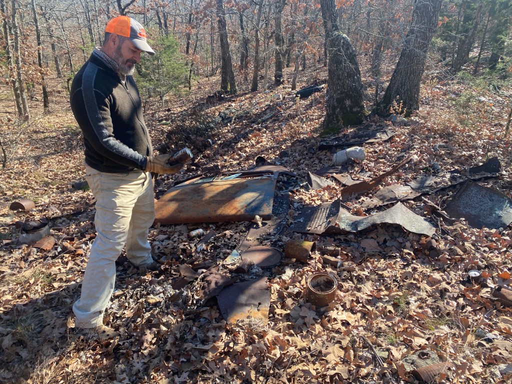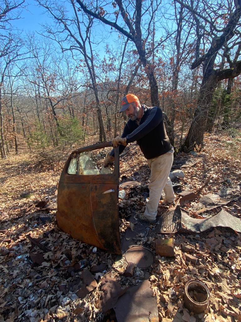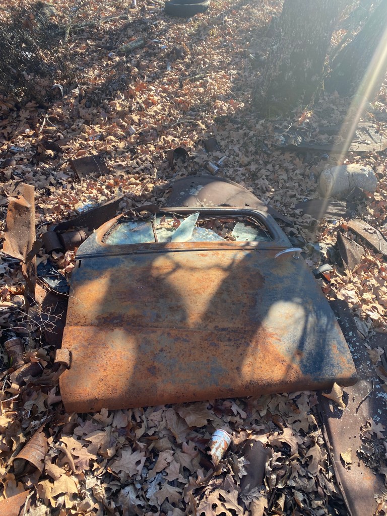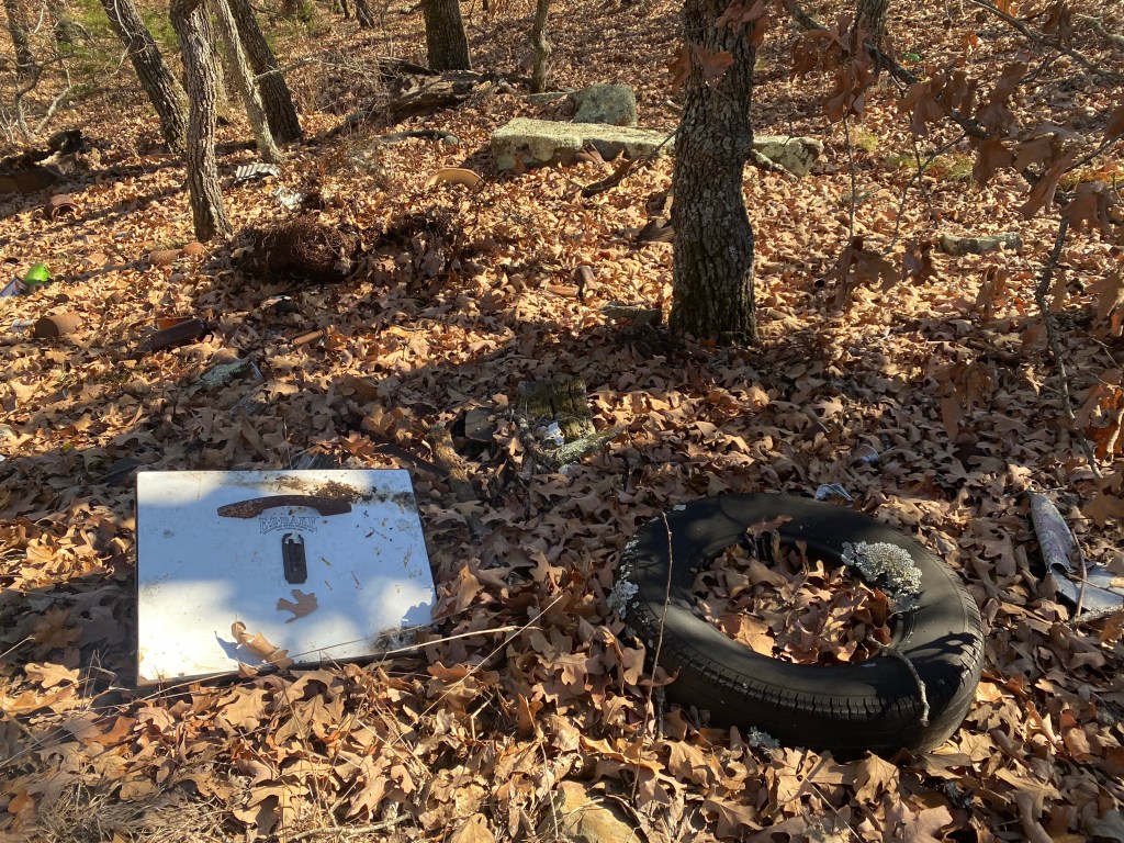 As we continued our ride, I see the familiar trails but along comes another less than desirable familiar site, another pile of trash… Y’all we are out in the middle of the acreage. I don’t know how they even got it all out this far to dump. It was nearly buried by fallen leaves but low and behold we have another door to add to our collection. (See Is this Mater? post for our first one). We found another pile of beer cans, an assortment of metal pieces, tires and even an easy bake oven door.