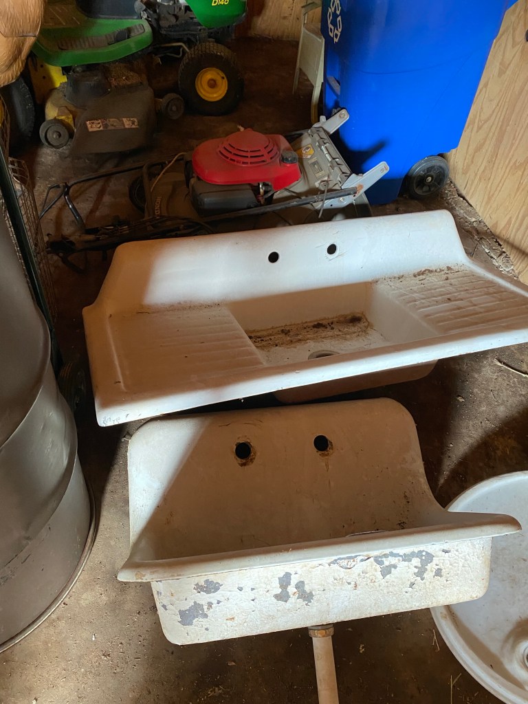 Check out the old sinks we found at an antique store for the shed. Big one is for kitchen and smaller one for bathroom.