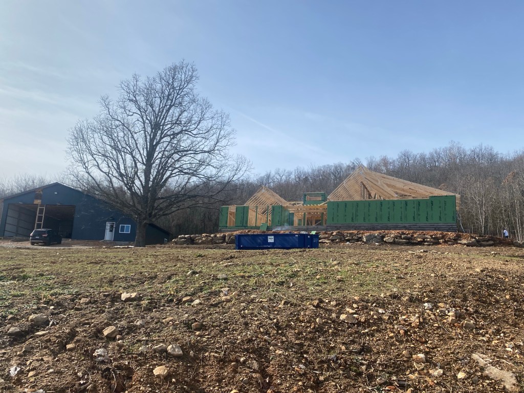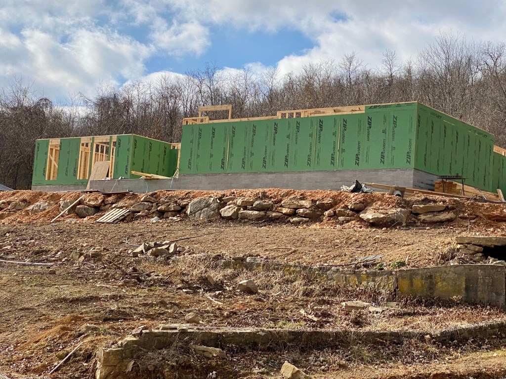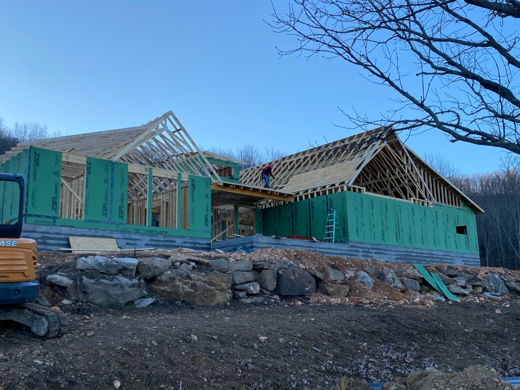 The house is coming along…. They are still sheeting but you can start to get the feel of how it will look. Also picked out exterior rock and windows. One step closer.