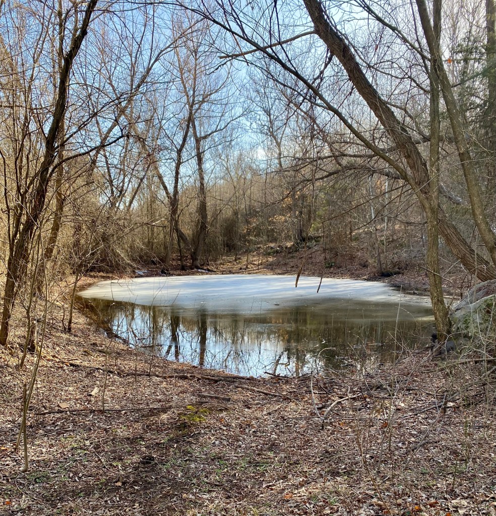 This is one of 4 ponds on the property. It is still melting off some of the ice from this latest storm. I love the majestic look and can totally see the addition of a tire swing one day.