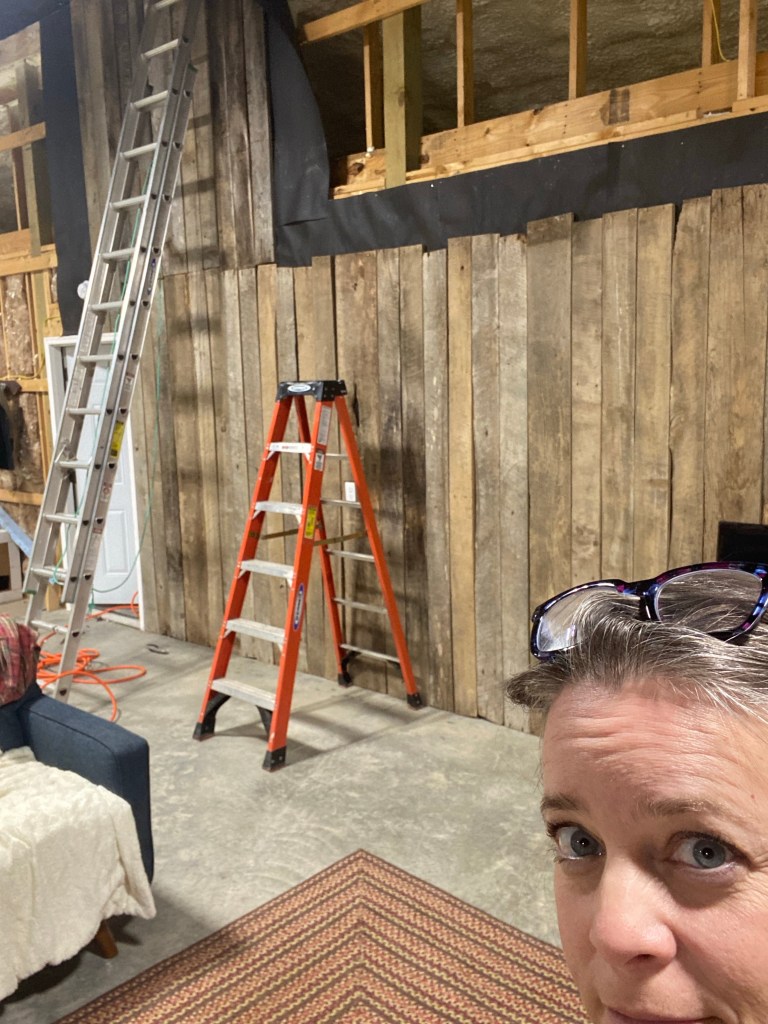 Probably no surprise to y’all but Scott had the pleasure of the big ladder and the nail gun. Me.. I handed up the boards and made a few small adjustment cuts as needed.