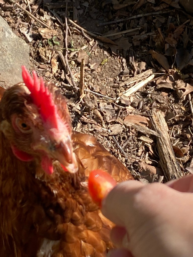 “The girls” as I call them are now free to roam during the day. They have established their pecking order… didn’t know that was a thing… but the head girl is mean…. until the real head girl comes out with tomatoes and then she is my bestie! I have a few of the big girls eating from my hand and aren’t afraid to come to me.