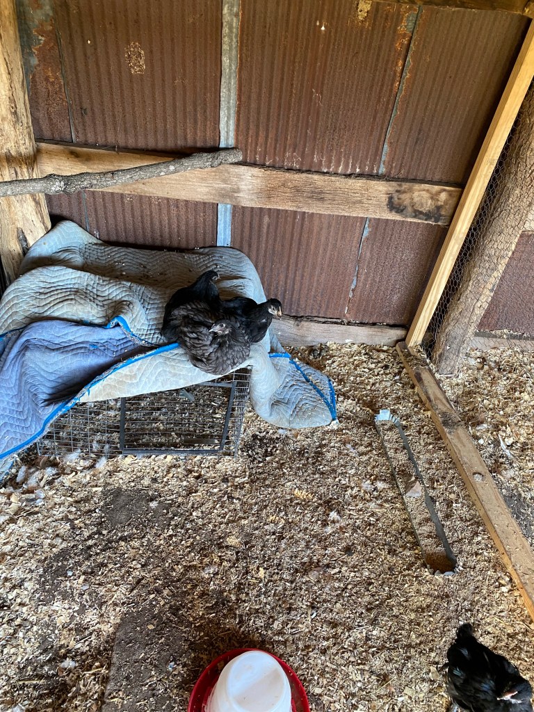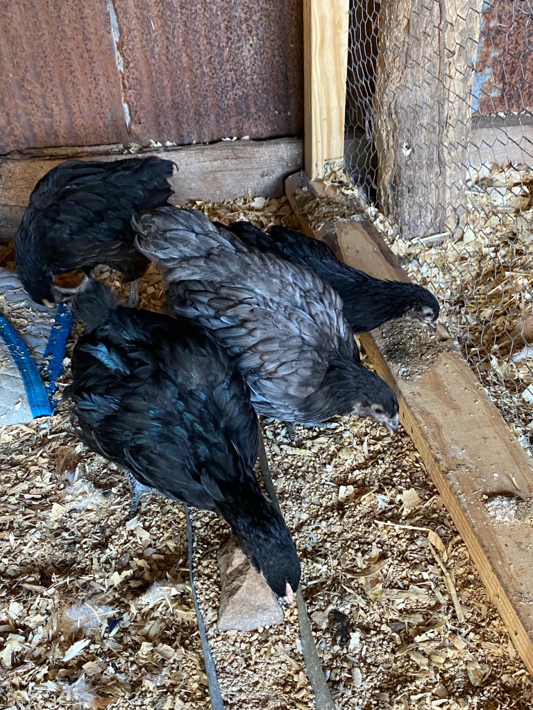 “The little girls and boy” are growing. They can make it up to the top of their cage to roost. They are so funny as soon as I feed them the are all up in their food tray scratching it out and making a big ole mess! They make the sweetest chirp sounds and you can tell they are still babies. They haven’t been out of their pin yet and I’m sure the big girls have dibs. Don’t want to see that pecking order get worked out…