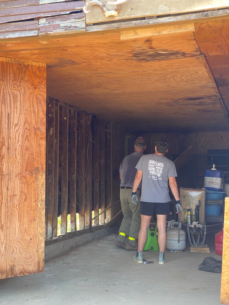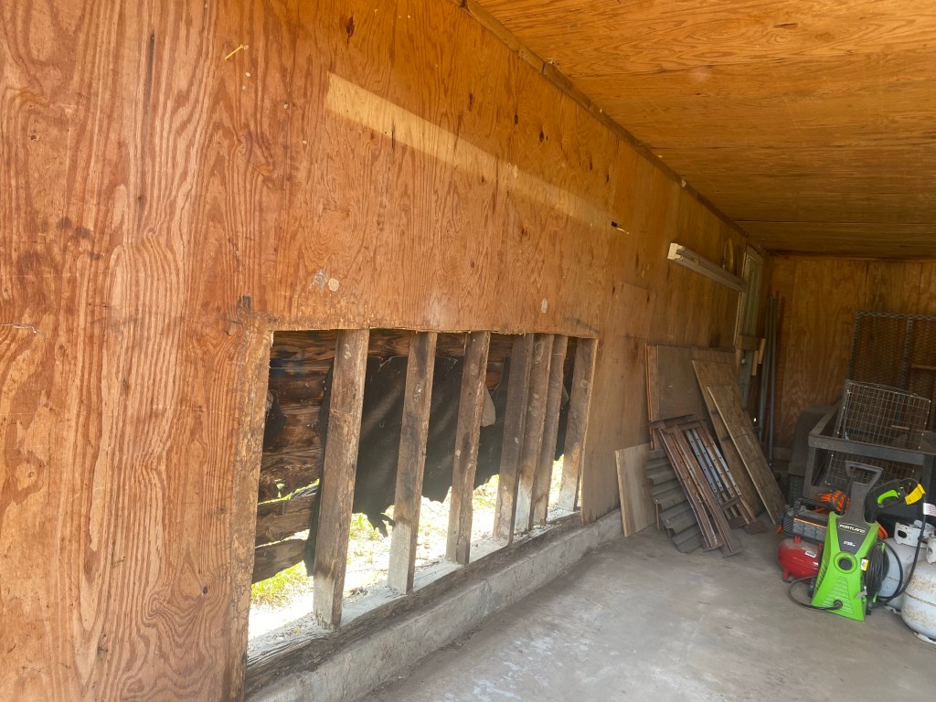 He’s got the “eww” all out of the shed. Next up patch work and replacing seals and then side walls. We are gonna leave the rafters visible. We also need to figure out how to talk the wasps into a new home. They are swarming all around trying to find their next new nesting spot.