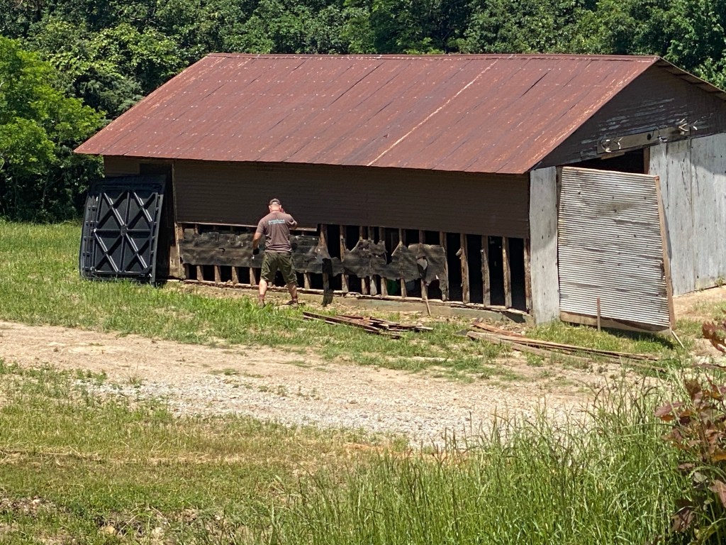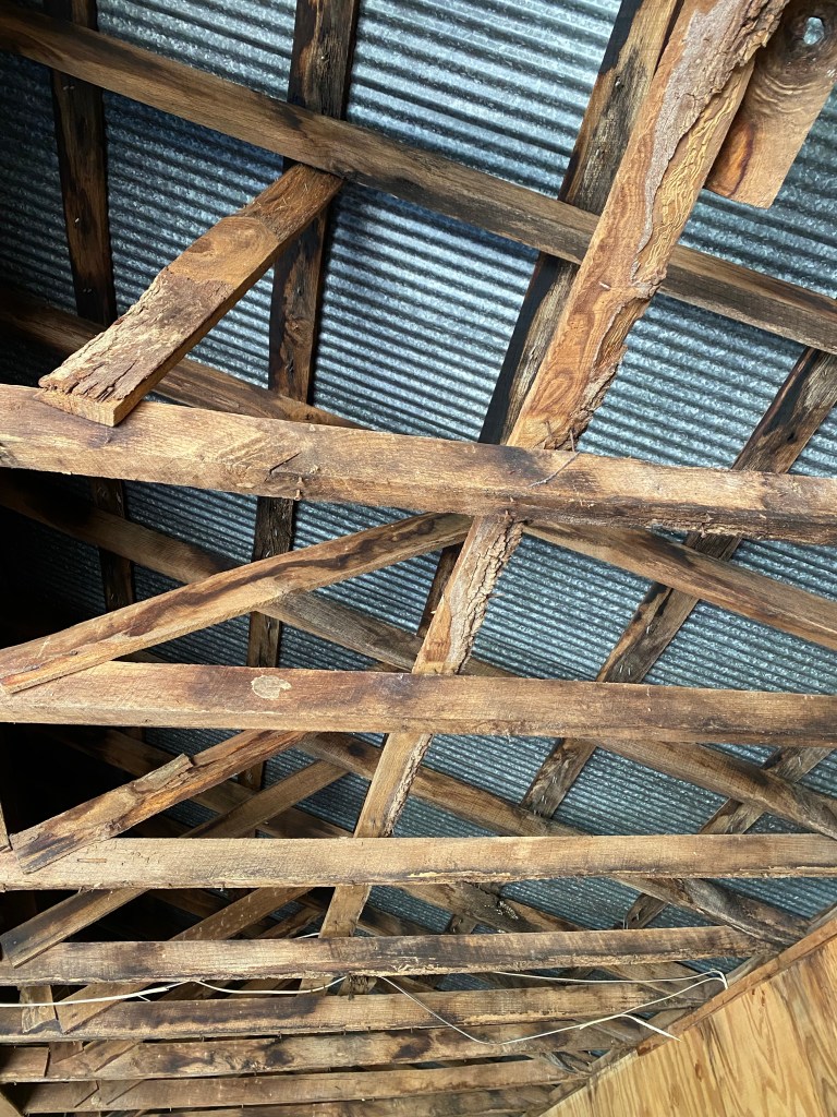 He is slowing tearing out the ceiling, side walls and eventually will put new seals, supports, and then tin on it. Planning to put up black tin to match the other buildings here on Needle Eye.