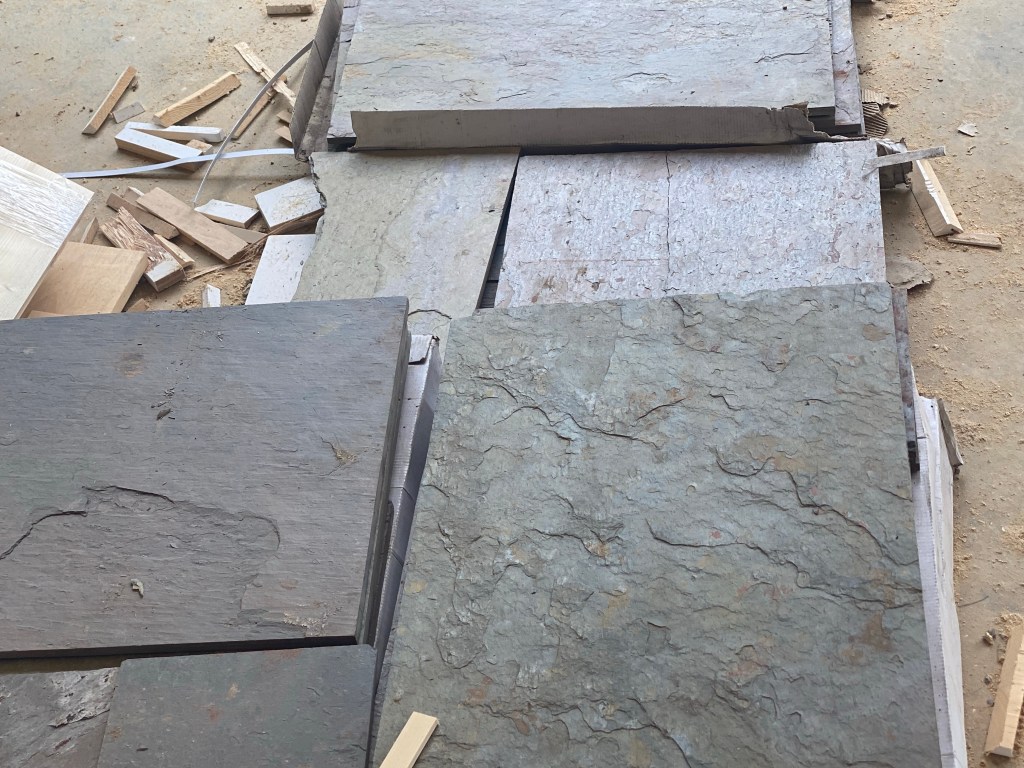 I ordered the slate tile from California. The delivery was quite the process. They said the load weight 1,200 pounds??? I’m thinking… yikes how much did I order??? But the trucking company showed up with a fork lift and a loader so it wasn’t too much work for us. Now for the tile guys…. Hmmm that’s gonna be a few trips! The rest of the tile we picked up from a local shop. Took a couple of truck loads and a lot of muscle to unload it!