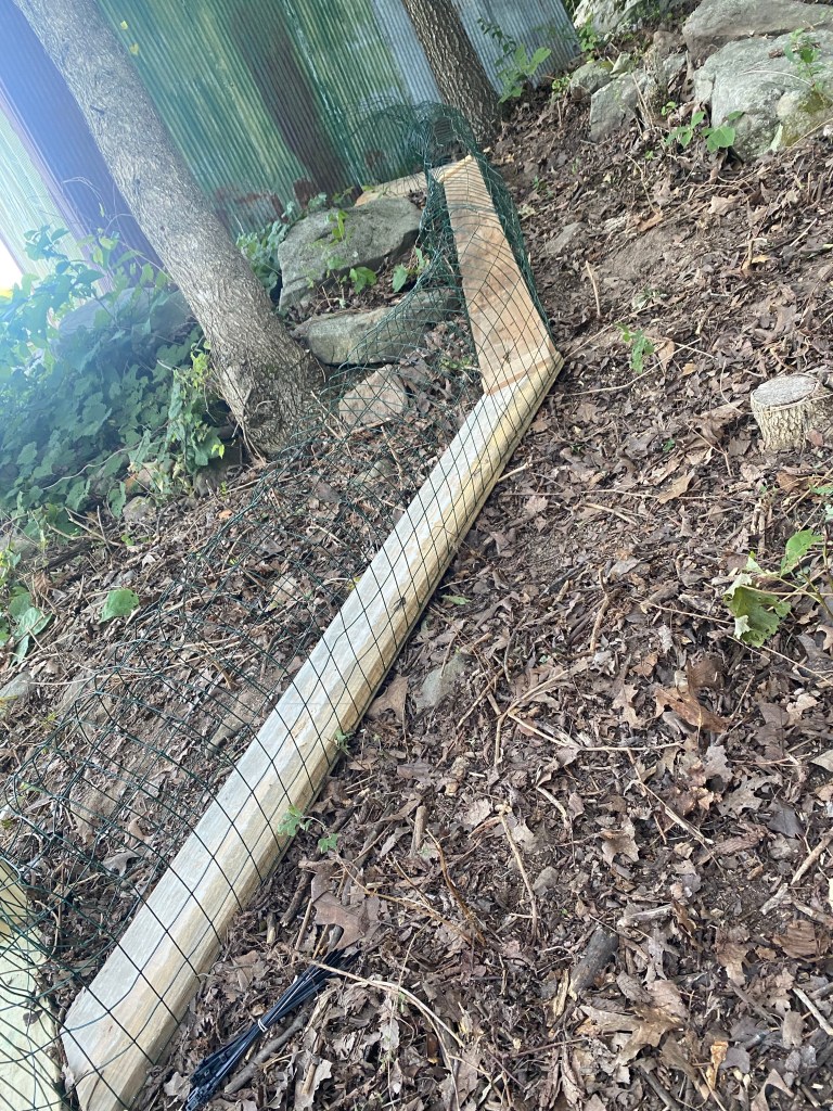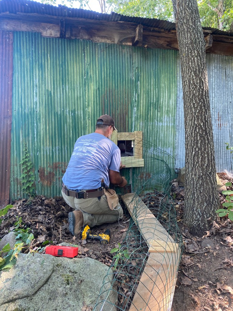 Scott put up a trail cam so we can watch for any additional critters and low and behold last night a whole family of raccoons came to inspect the new run…. So now we are making a top for the run… take that again critters…. Life on Needle Eye is certainly not boring!