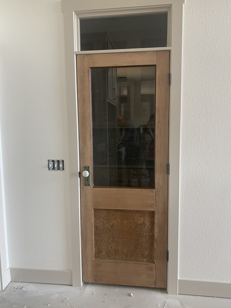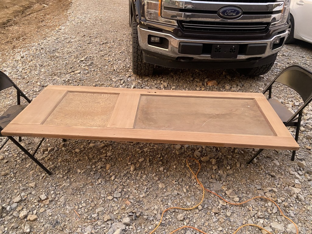 I got it as smooth as possible but still saved it’s old nicks and booboos. I did a light white wash and then rubbed on wax to finish it off. Then I passed it over to our builder to cut out the top panel and add glass.